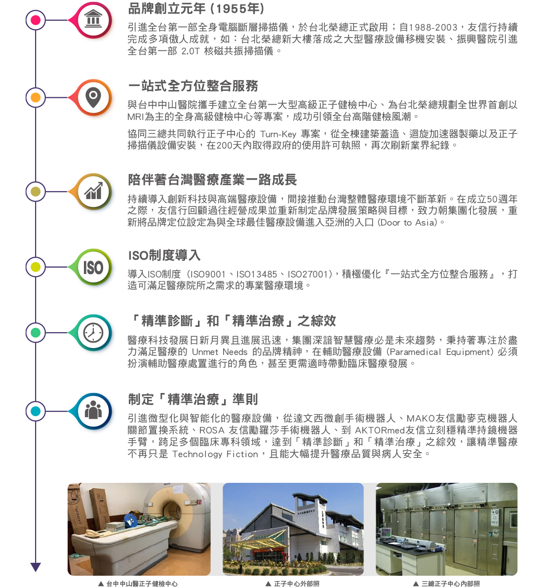 持續導入創新科技與高端醫療設備,間接推動台灣整體醫療環境不斷革新。在成立50週年之際,友信行回顧過往經營成果並重新制定品牌發展策略與目標,致力朝集團化發展,重新將品牌定位設定為與全球最佳醫療設備進入亞洲的入口 (Door to Asia)。
